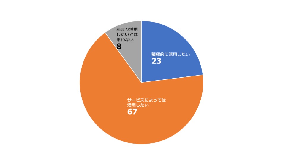 そのような環境もあり、スマートフォンで完結可能なオンラインサービスは「非常に便利(38%)」「やや便利(51%)」で肯定的評価が89%、今後の利用についても「積極的に活用したい (23%)」「サービスによっては活用したい(67%)」で肯定的評価が89%となりました。