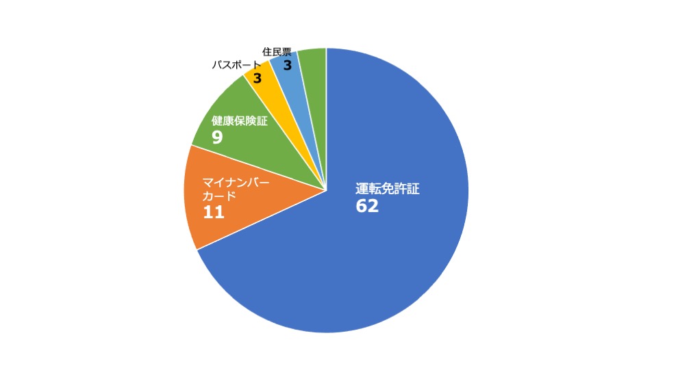 顔写真付きオンライン本人確認書類といえば圧倒的に多いのが運転免許証(62%)ですが、次いで顔写真付きマイナンバーカードの利用(11%)となりました。