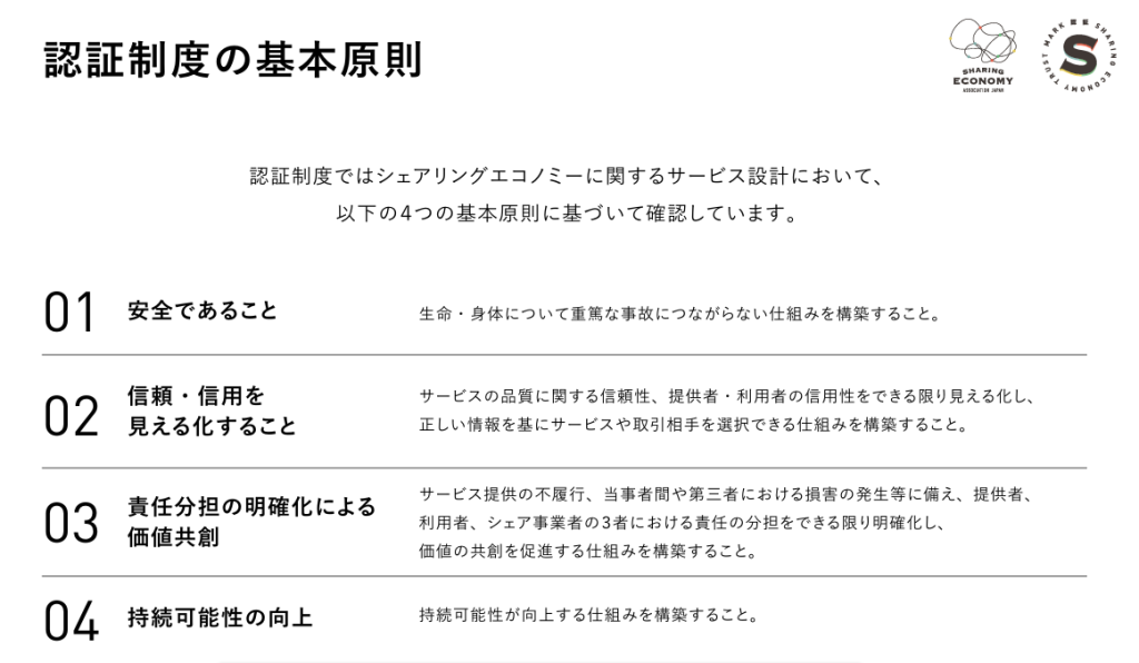 本人確認の徹底は、サービスの安全性・信頼性を向上させることにも有効です。取引相手の信頼性を担保していることは、サービス品質の高さにもつながります。 ちなみに、一般社団法人シェアリングエコノミー協会による「シェアリングエコノミー認証制度」では、次の4つが基本原則とされています。