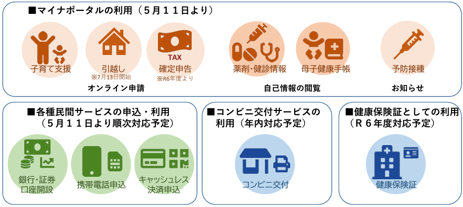 マイナポータルを活用したサービスは2023年5月11日~利用可能になっており、今後マイナンバーカードを利用した民間サービス、コンビニ端末での利用、健康保険証としての利用など順次対応サービスが拡大する予定です。