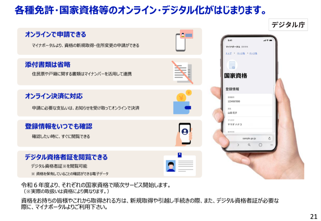 システム整備をデジタル庁で進めており、6月以降順次、資格者の手続きをマイナポータルから可能にし、添付書類の省略などを実現していきます。