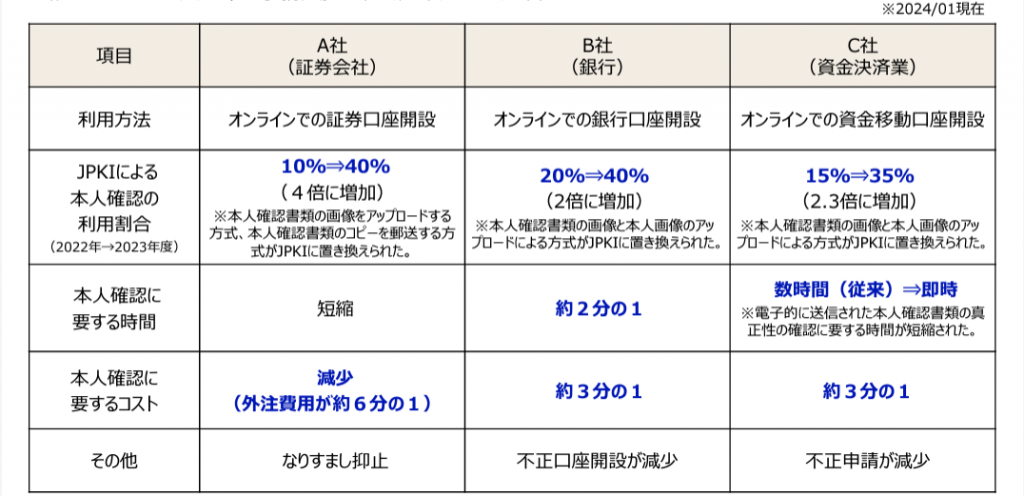 デジタル庁において、JPKIの導入事業者にヒアリングを行ったところ、マイナンバーカードによるJPKIを活用した本人確認の導入効果については以下のようになっています。